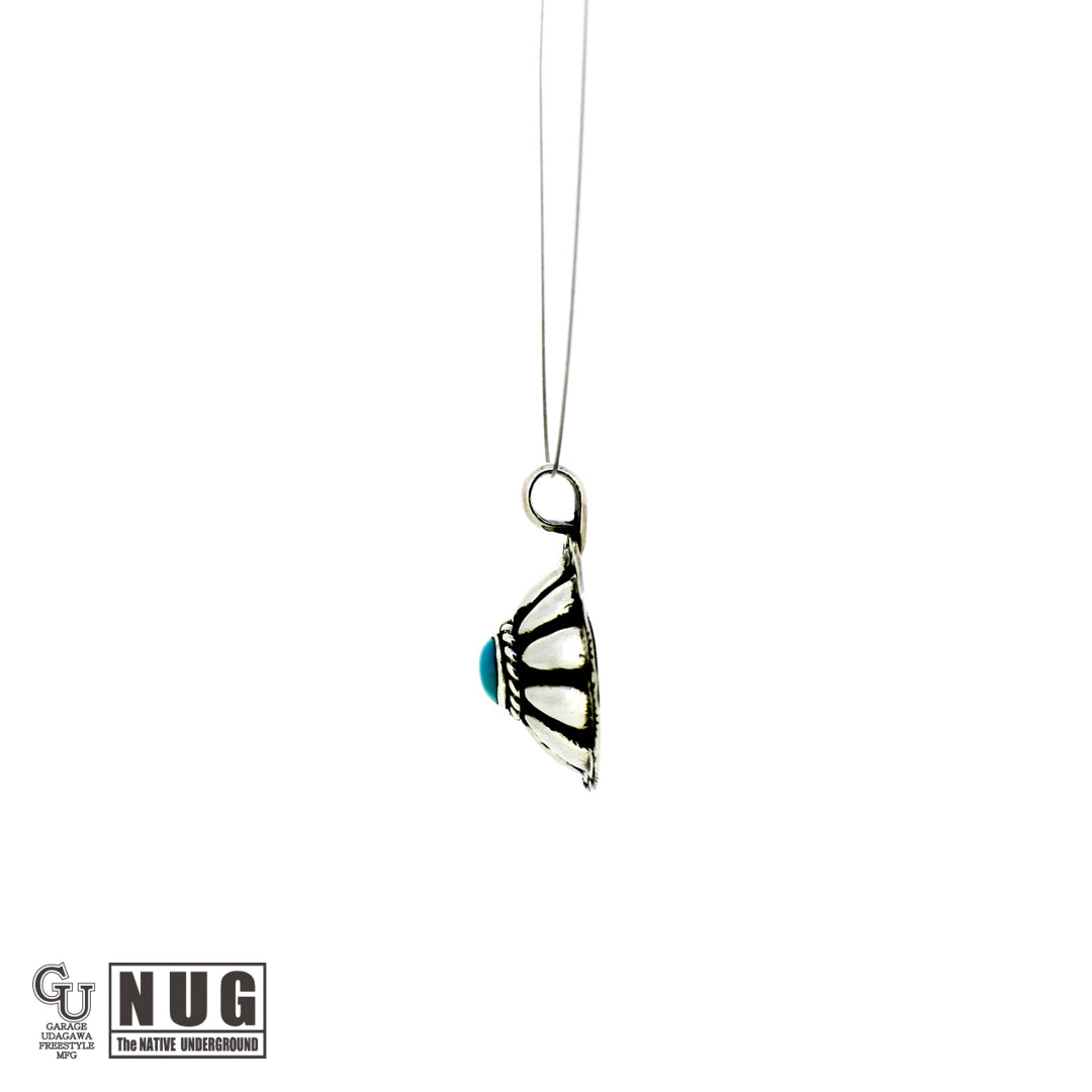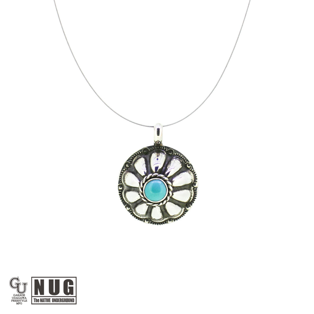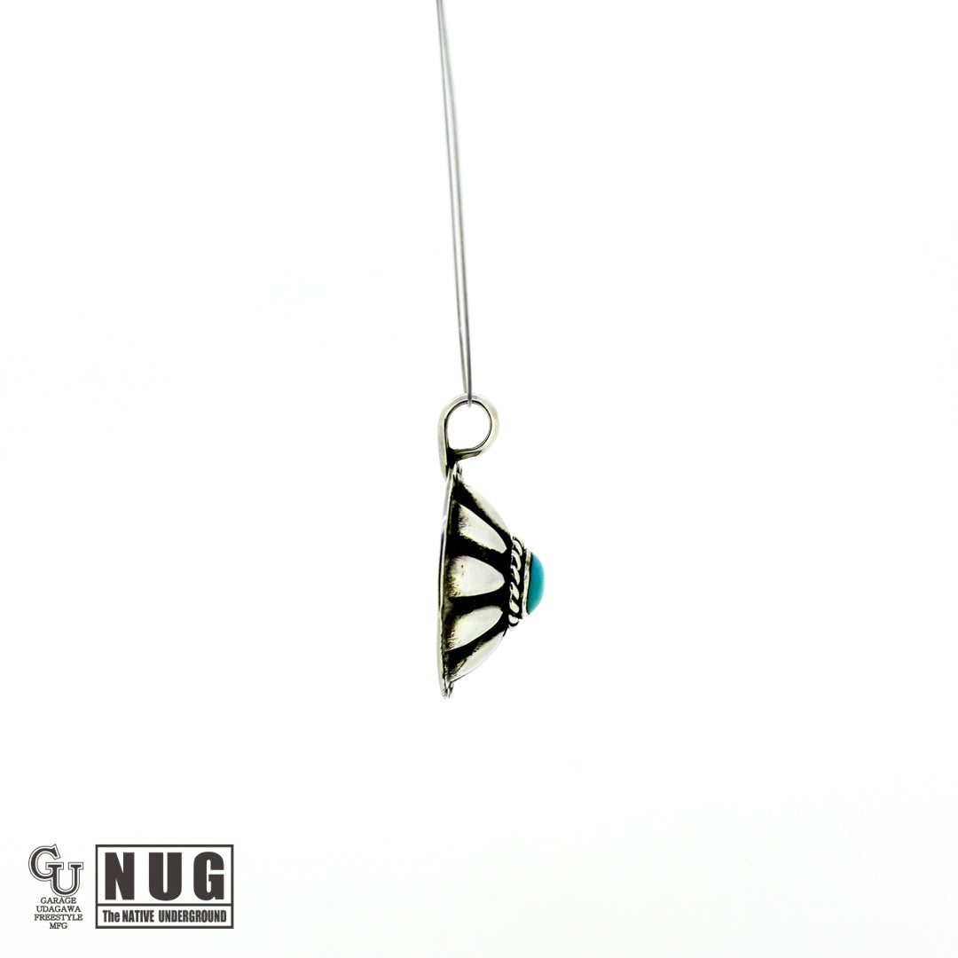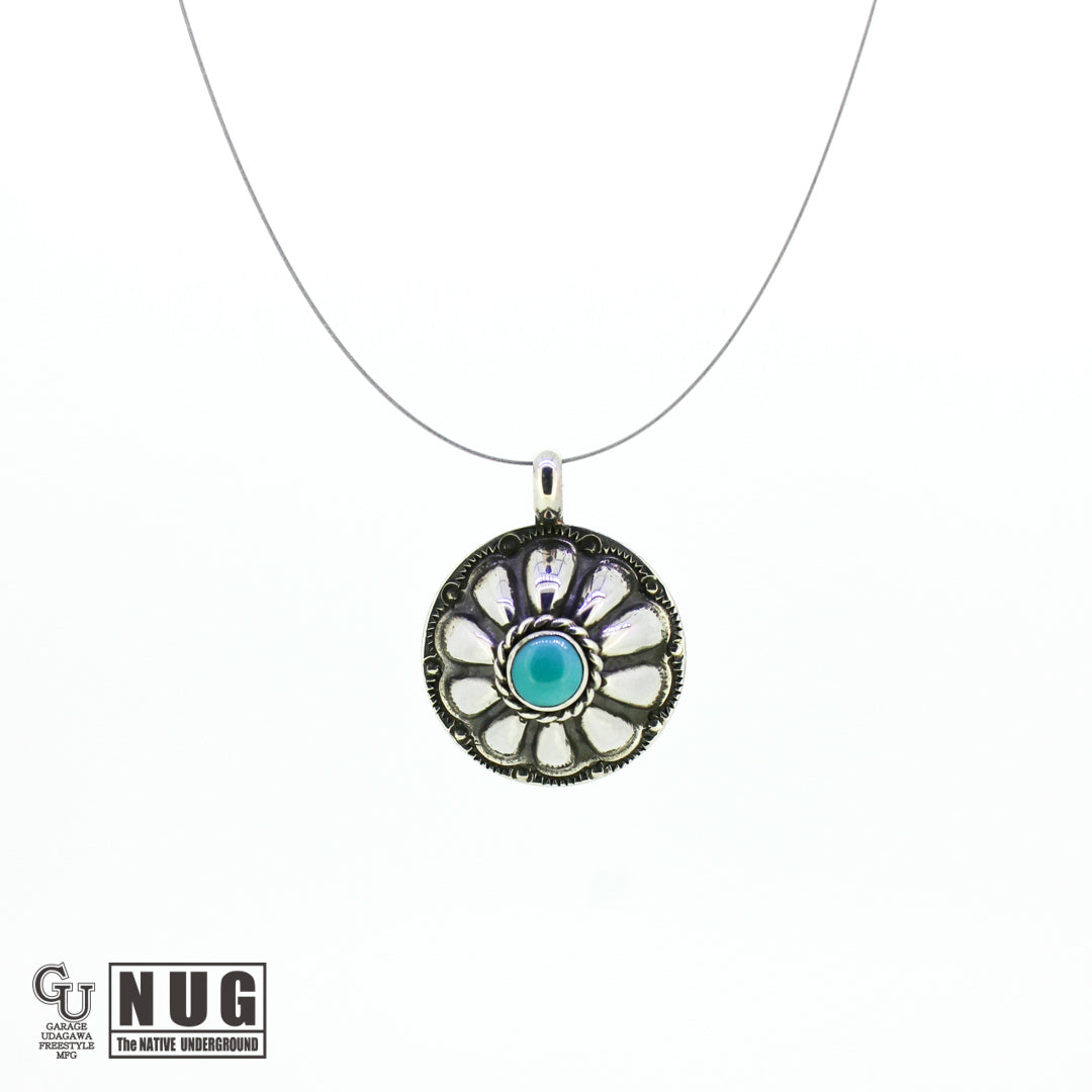 ペンダントヘッドの淵部分には細かな模様をスタンピングで施してあり、中央部にはアリゾナ州キングマン鉱山で採掘された原石を一つ一つ削り出して研磨して取り付けています。