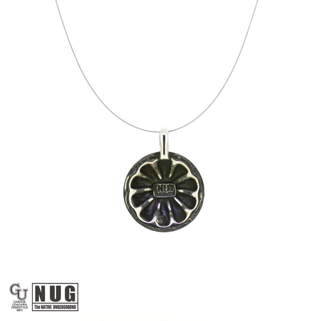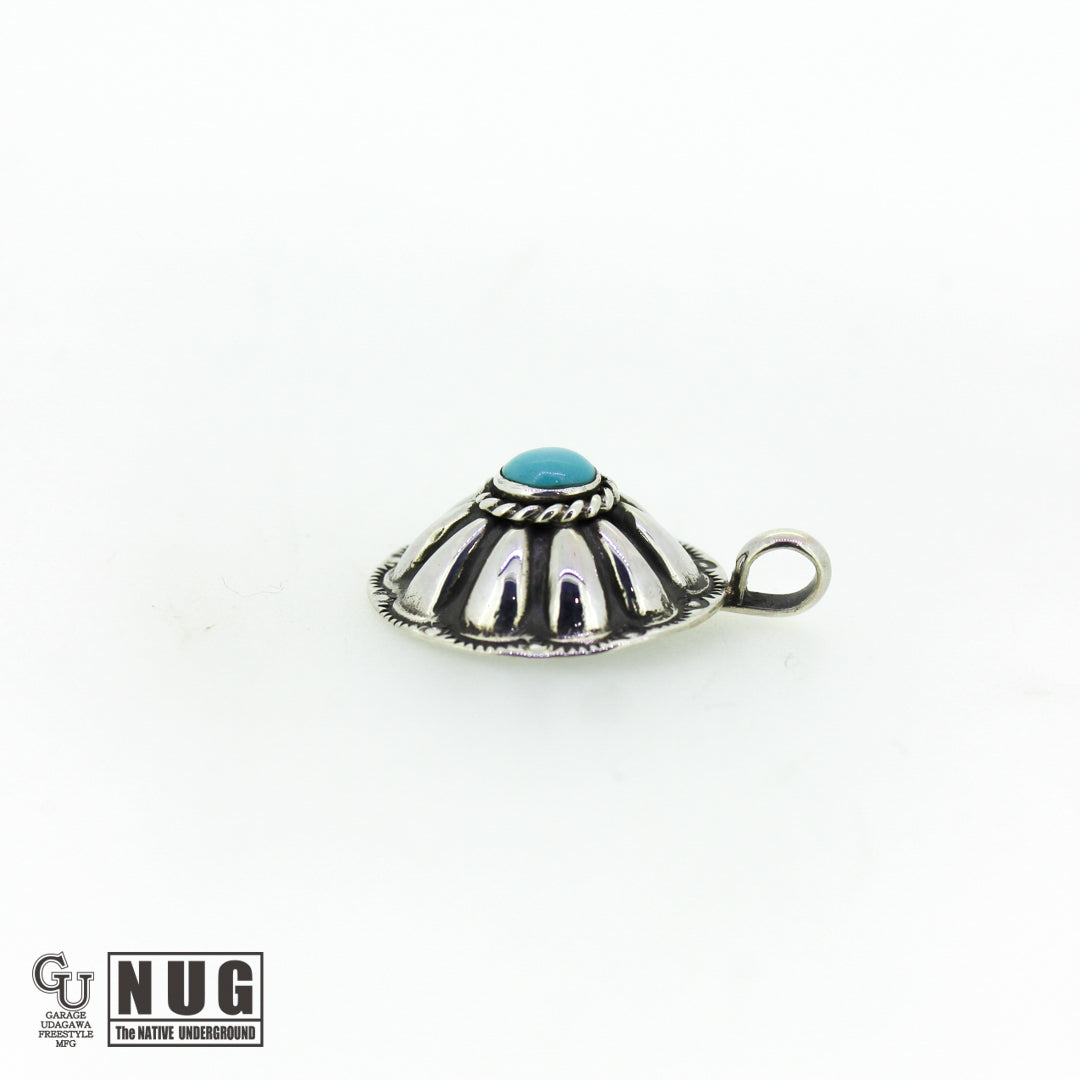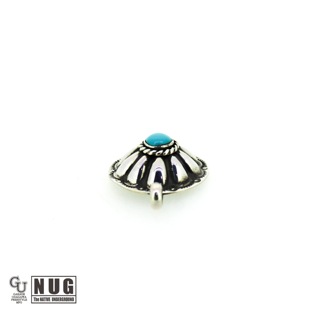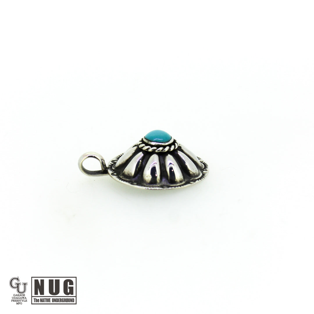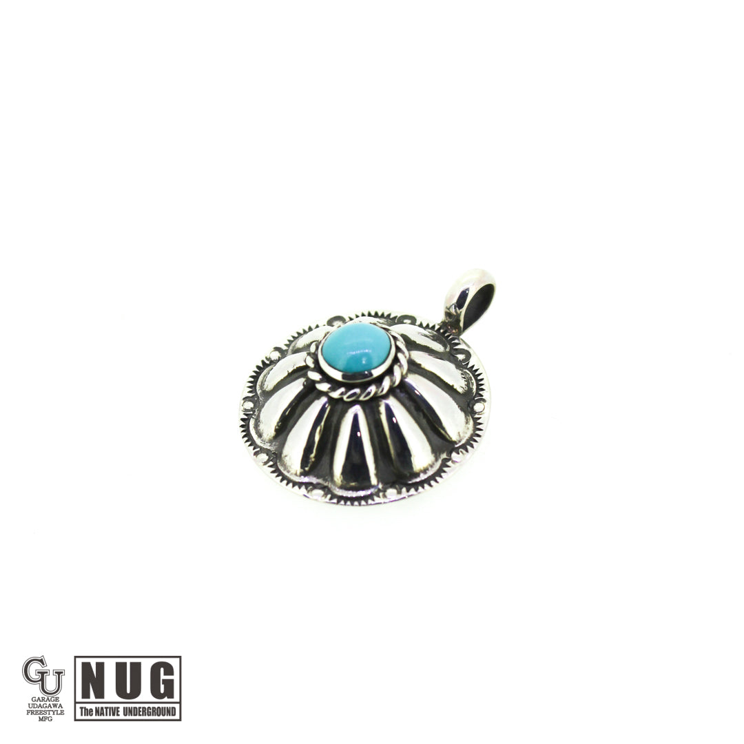 ペンダントヘッドの淵部分には細かな模様をスタンピングで施してあり、中央部にはアリゾナ州キングマン鉱山で採掘された原石を一つ一つ削り出して研磨して取り付けています。