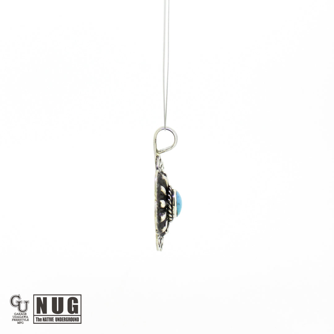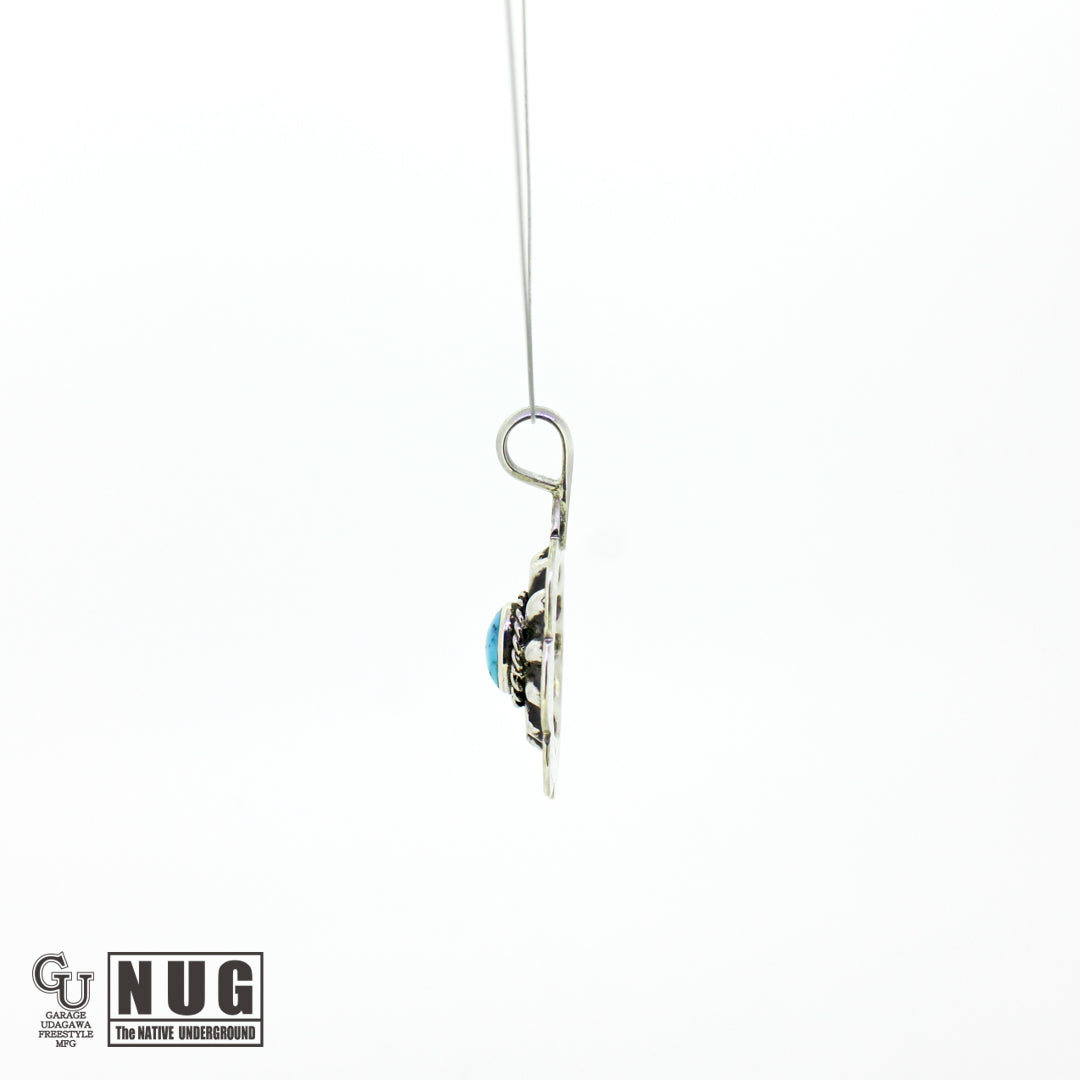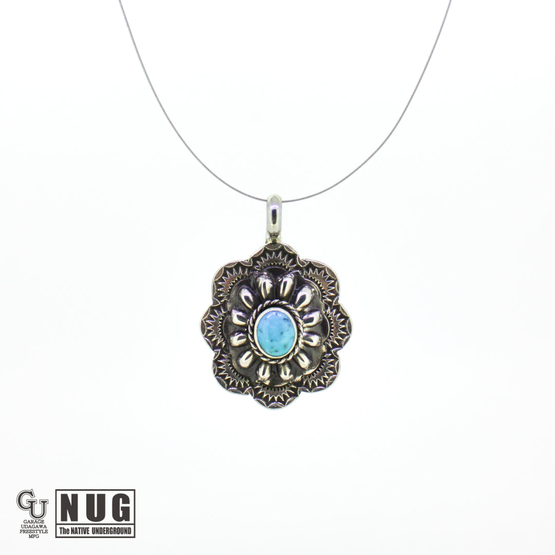リポウズスタンプワークで叩き出したペンダントヘッドの中央部にはアリゾナ州キングマン鉱山で採掘された原石を一つ一つ削り出して研磨して取り付けています。