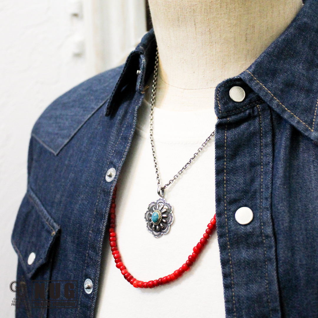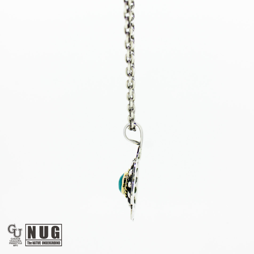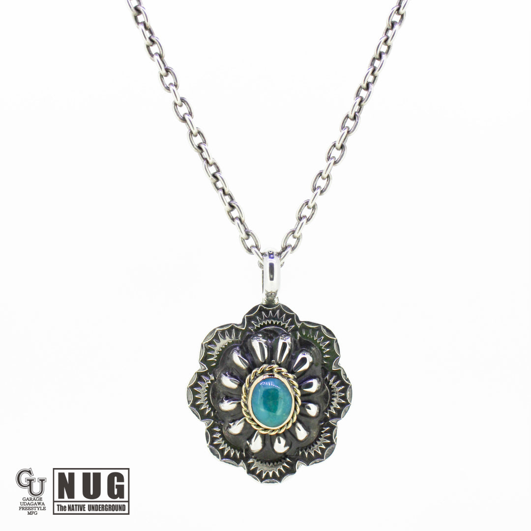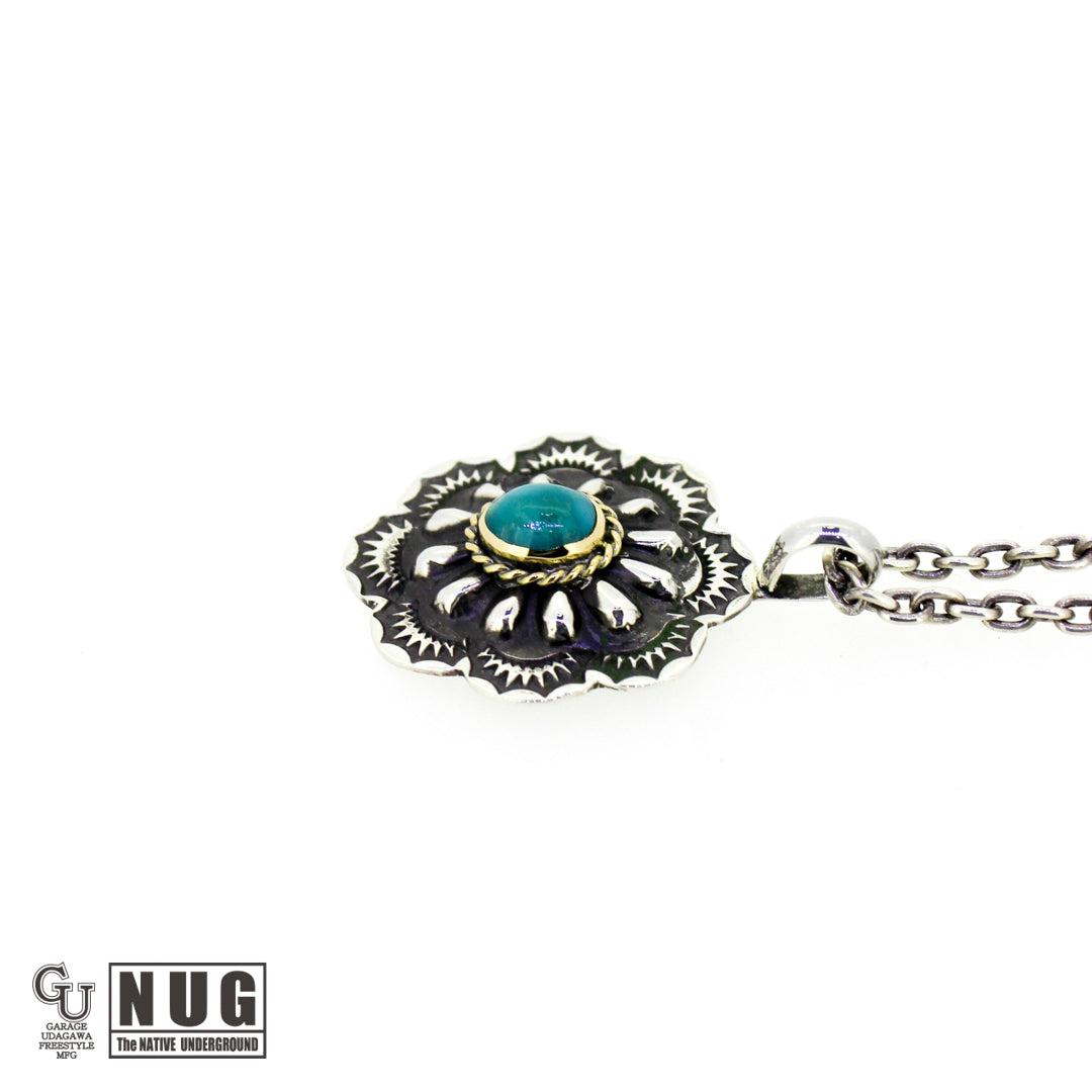 リポウズスタンプワークで叩き出したペンダントヘッドの中央部にはアリゾナ州キングマン鉱山で採掘された原石を一つ一つ削り出して研磨して取り付けています。