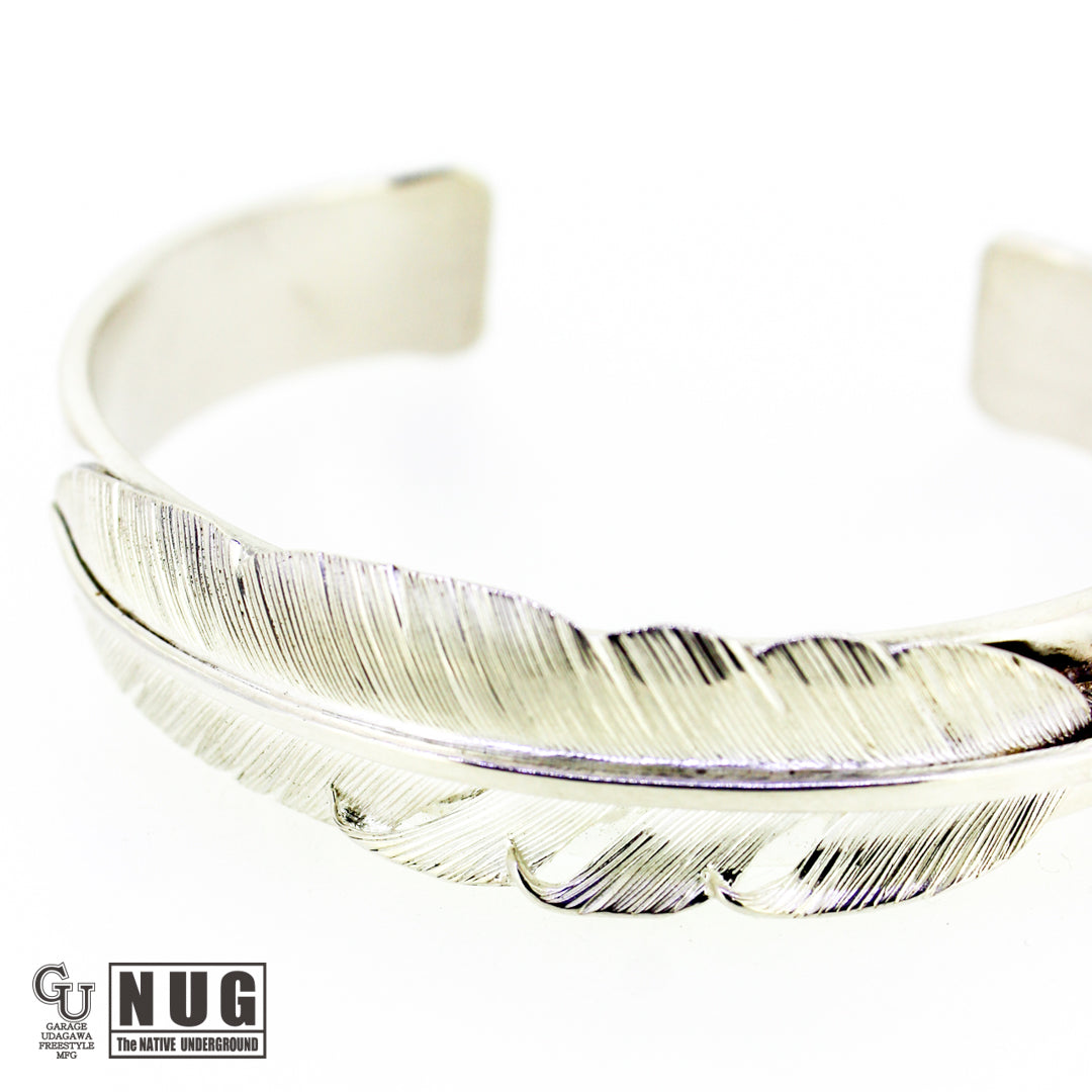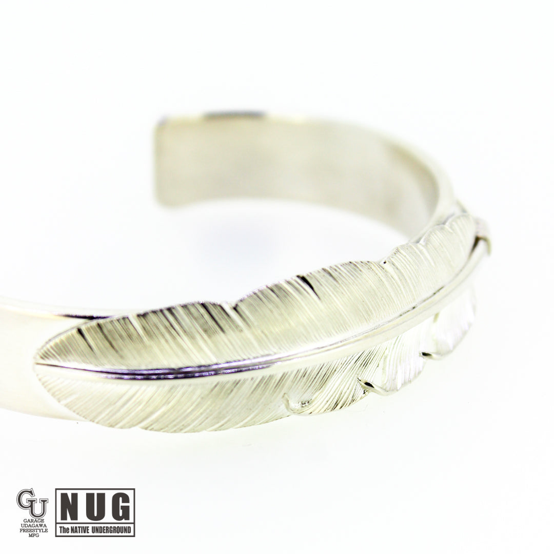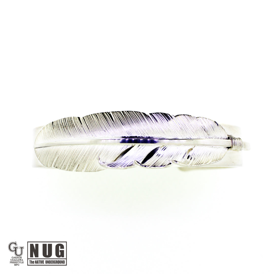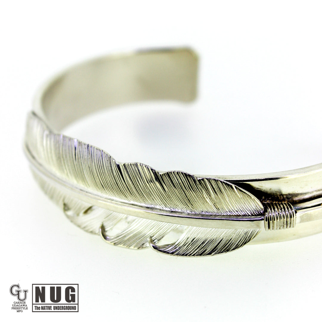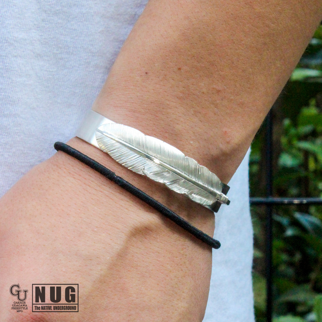 フェザーは1枚の銀板から毛彫り鏨(タガネ)を用いて1筋ずつ丁寧に彫り上げていく技法によって仕上げられており腕に馴染むよう丁寧に湾曲にしています。