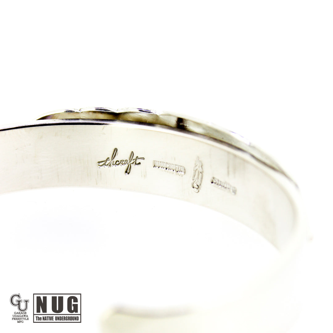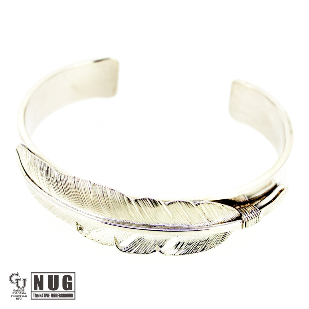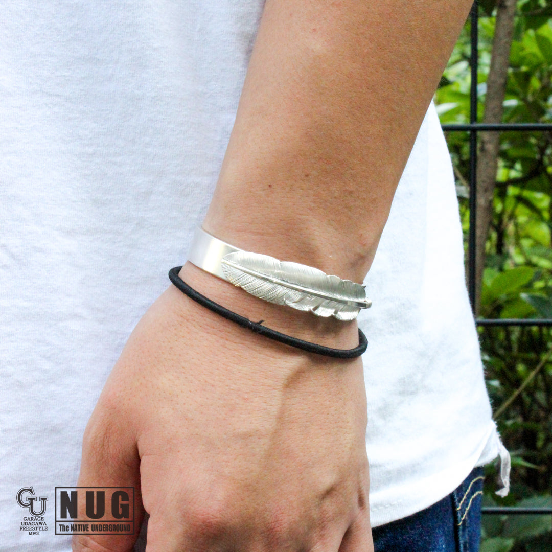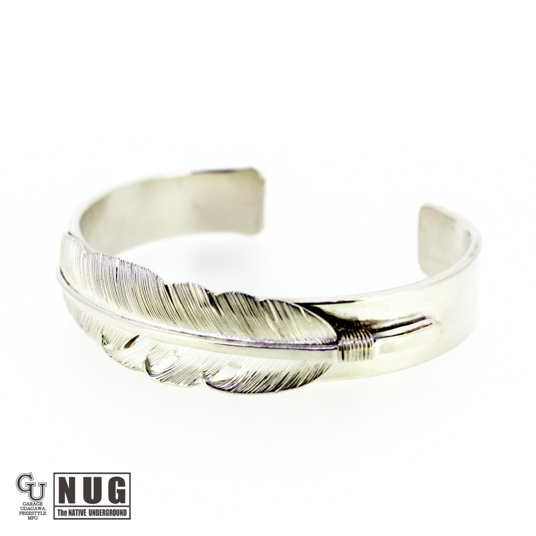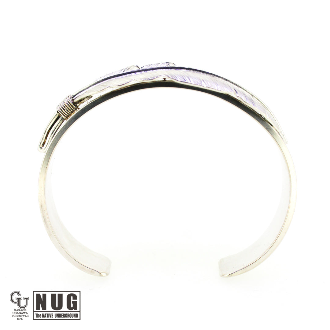 フェザーは1枚の銀板から毛彫り鏨(タガネ)を用いて1筋ずつ丁寧に彫り上げていく技法によって仕上げられており腕に馴染むよう丁寧に湾曲にしています。