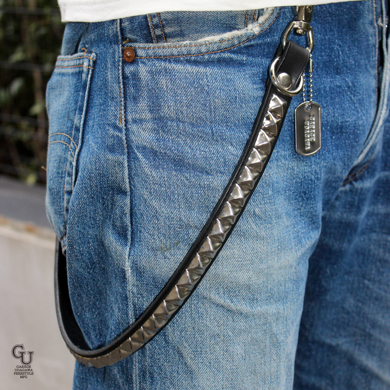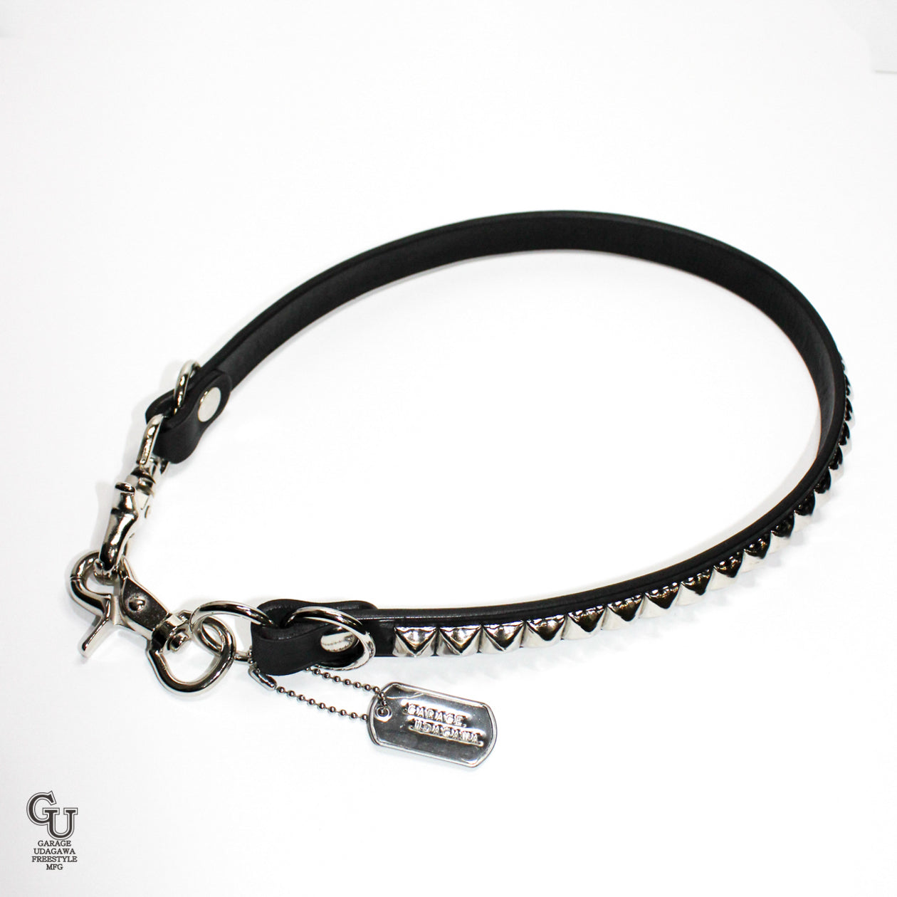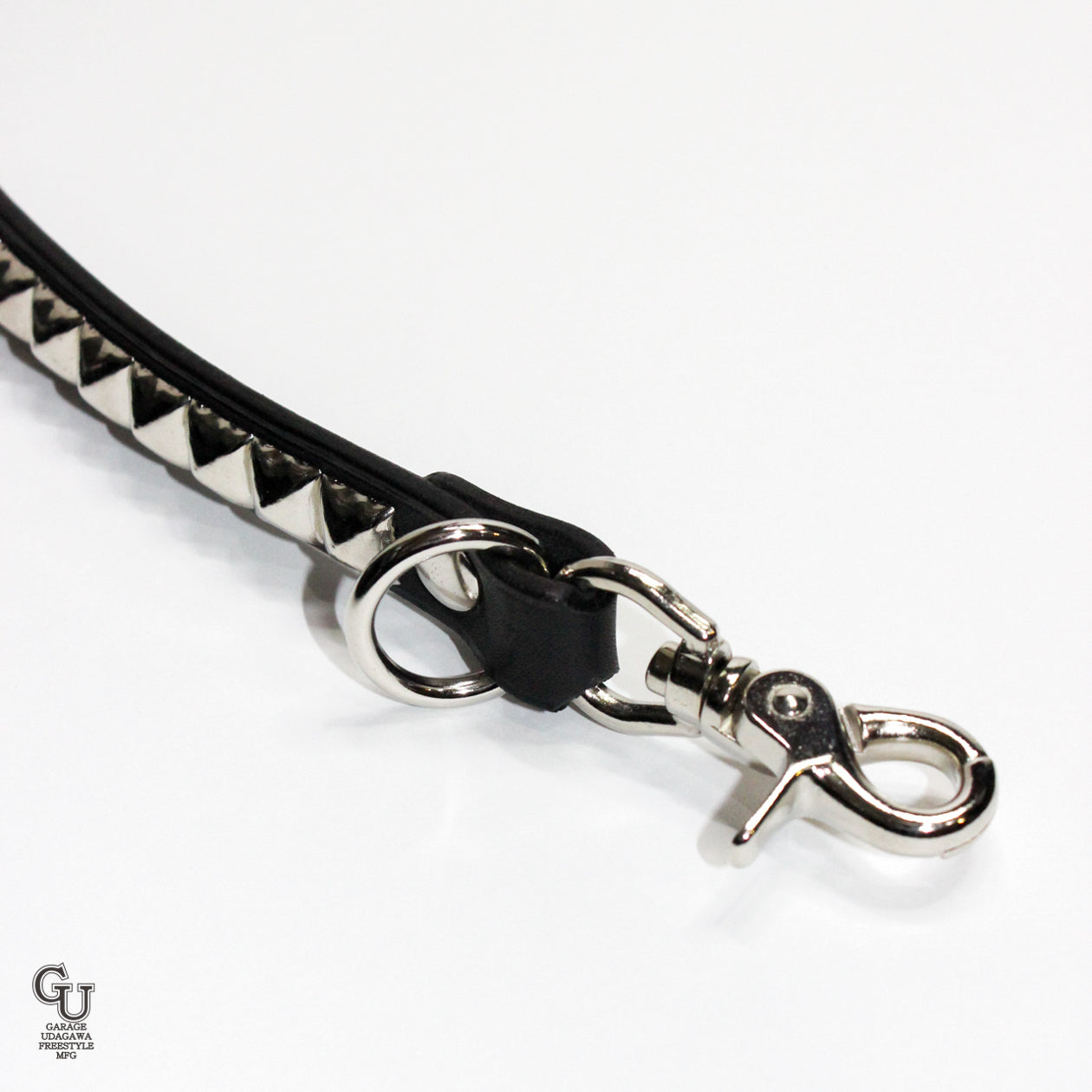 スタンダードサドルレザーにUSA製のピラミッドスタッズがひとつひとつ打ち込こまれたガレージウダガワオリジナルのウォレットコードです。