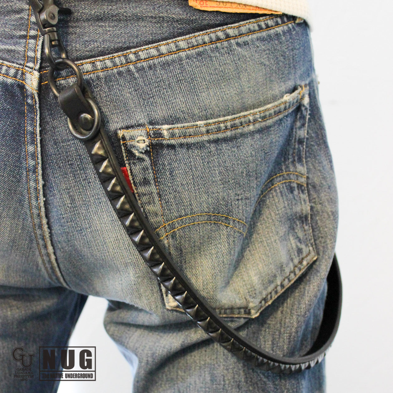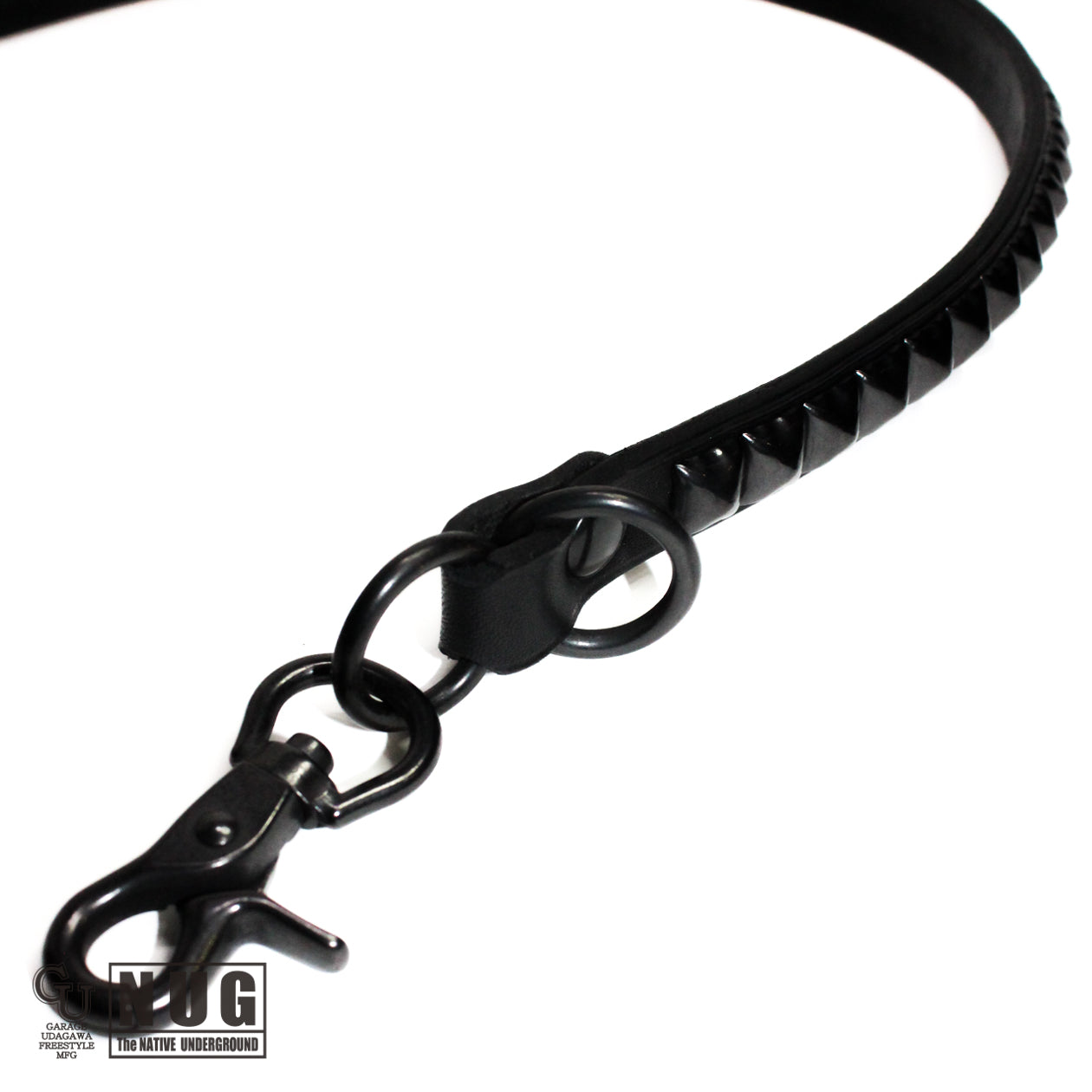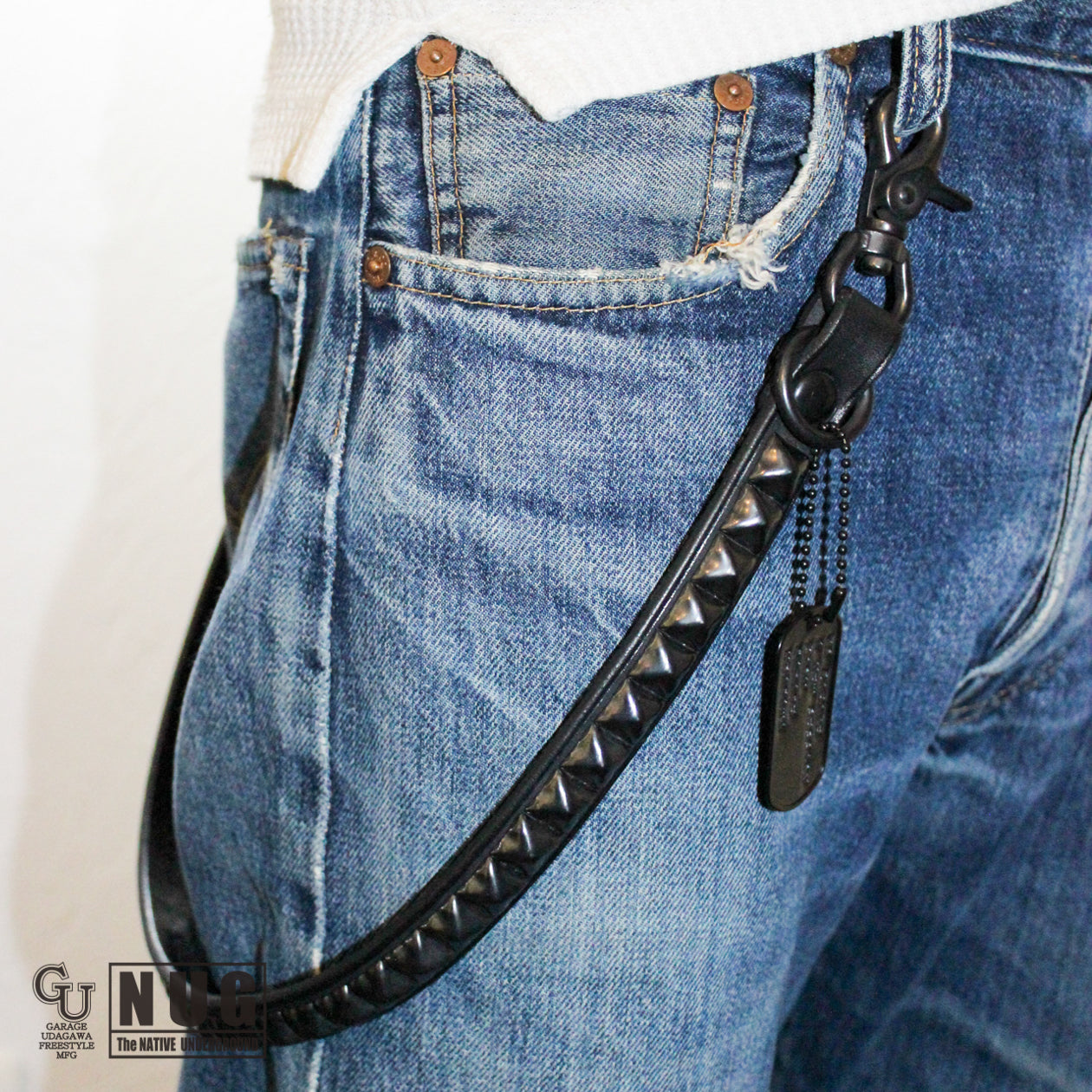 スタンダードサドルレザーにUSA製のピラミッドスタッズがひとつひとつ打ち込こまれたガレージウダガワオリジナルのウォレットコードです。