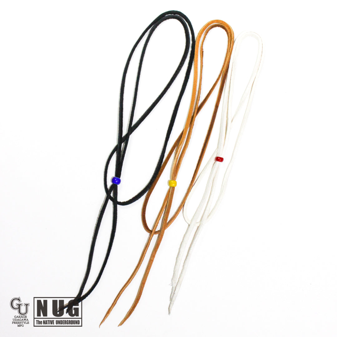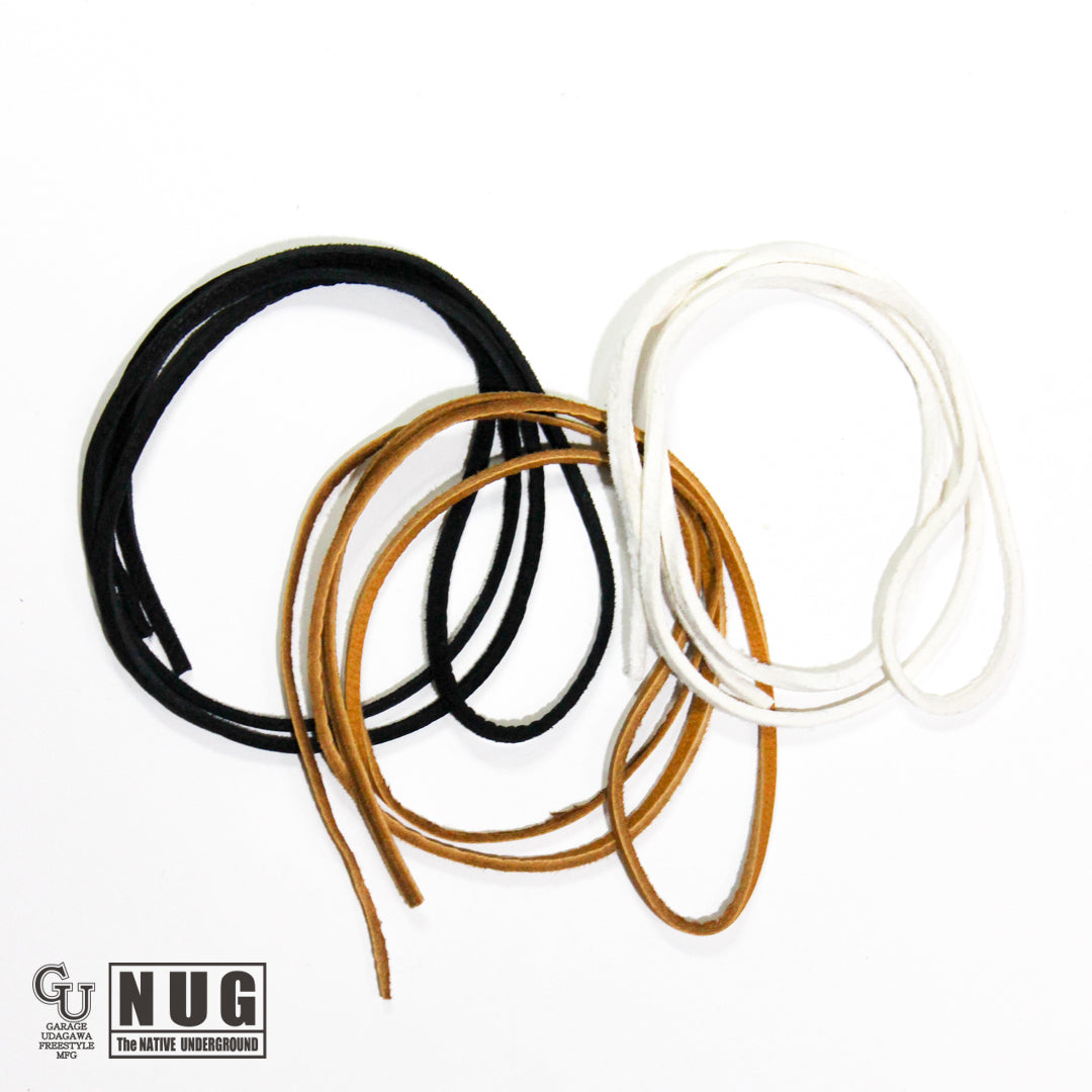 鹿革を半裁からレース上に裁断した吟付きのディアスキンレース(鹿 革ひも)の3色セットです。