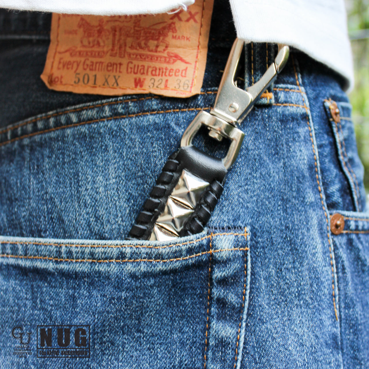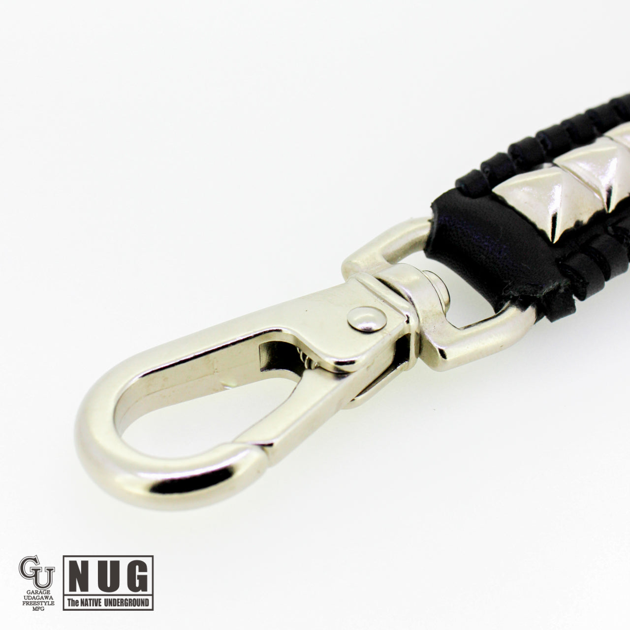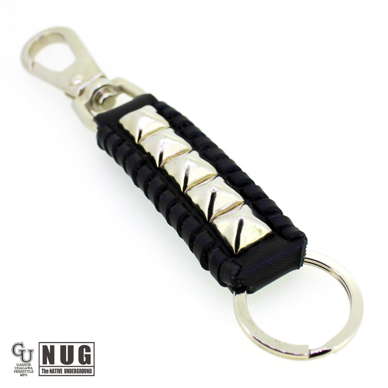 アメリカンオイルレザーにUSA製のピラミッドスタッズ(ニッケル)が打ち込こまれたガレージウダガワオリジナルのキーホルダーです。